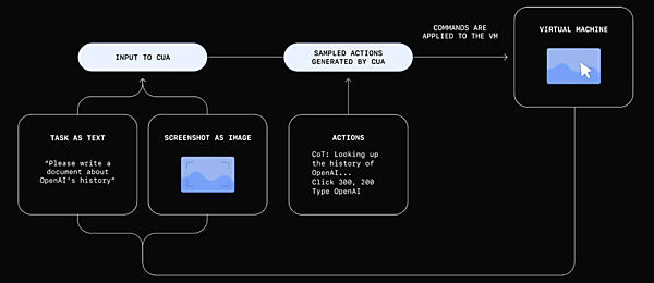 Operatorの背後には「Computer-Using Agent(CUA)*3」と呼ばれる新しいAIモデルがあり、これはGPT-4oの視覚能力と強化学習による高度な推論を組み合わせています。CUAは画面上のボタンやメニュー、テキストフィールドなどのグラフィカルユーザーインターフェース(GUI)を人間と同じように認識し、操作できます。