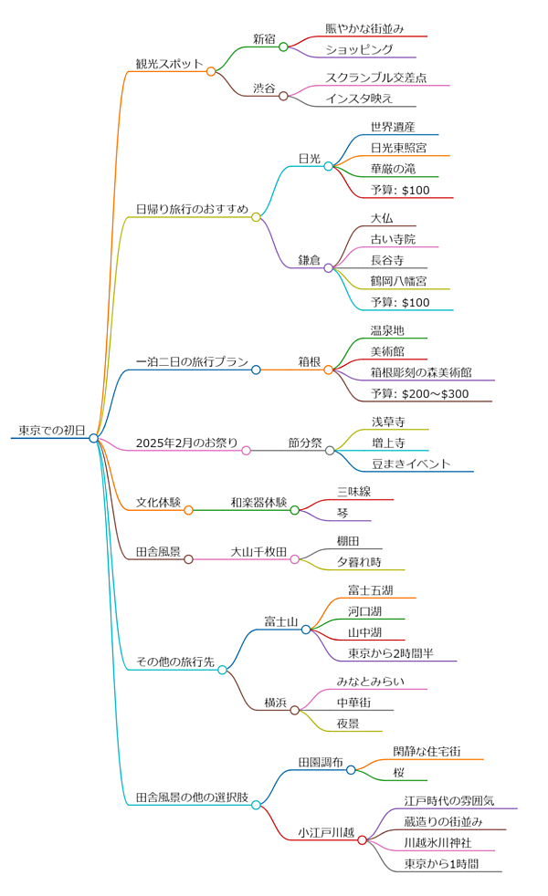 来月2025年2月に、2週間の予定で日本へ旅行に行きます。初日は東京に滞在しますが、予算の範囲内で日帰り旅行や1泊2日の旅行もしたいです。日本のお祭りや文化、音楽に興味があり、特に日本の田舎風景はインスタ用にぜひ押さえておきたいです。日本国内での予算は$500です。