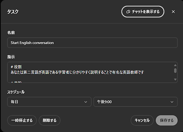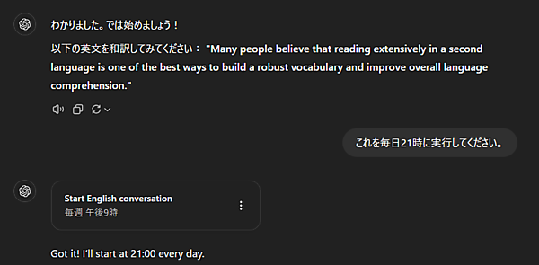 「TOEIC800」や「CEFR Level B1」の部分を変更することで、自分に合ったレベルを設定することが可能です。また、翻訳する英文を短くまたは長くする場合は「英文は15単語以上の構成」の部分を変更してください。また、最後の「このプロンプトを毎日21時に実行してください」でリマインドする時間を設定でき、この部分を削除すれば通常のプロンプトとしても実行可能です。