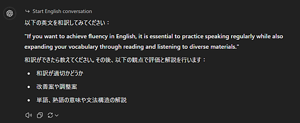 ChatGPTを英語学習に利用することで、これまでできなかったこと、特に「これで良いのかどうか分からない問題」については一定の目途がたったといっても過言ではありません。例えば、英文の和訳などは、単語の意味を辞書で調べても英語特有の言い回しまでは調べきれなかったりして、個人学習だけでは「この和訳合っているの?」という疑問を解消できませんでした。しかし、生成AIはこの悩みへの1つの解決策になりえます。