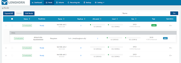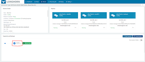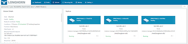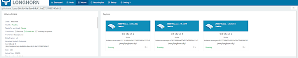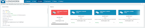 また、Longhornでは数十分待つとレプリカが3台目のワーカーノード以外(test-k8s-wk-1)にレプリカが立ち上がり、ボリュームがHealth: Healthyに保つように動作するようです。