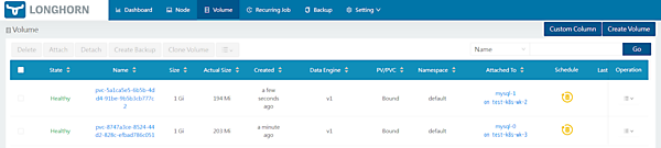 Longhornにおけるボリュームとは、Kubernetesにおけるpersistent volumes(PV)とpersistent volume claims(PVC)に対応します。
