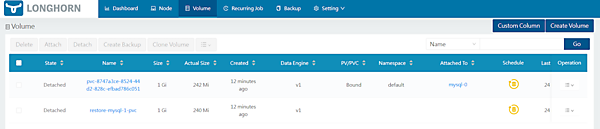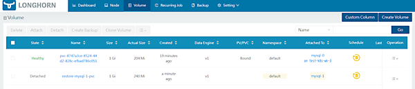 - この状態ではまだボリュームがアタッチされていないため、restore-mysql-1-pvcボリュームを選択して[Attach]をすることでStateはHealthyとなります。