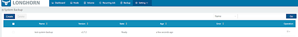 バックアップをするには、上部のSettingsタブから[System Backup]を選択します。左上にある[Create]をクリック後、ポップアップに適宜入力するとシステムバックアップが開始されます(ここではバックアップ名をtest-system-backupとした)。StateがReadyとなれば成功です。