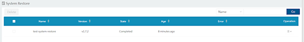 試しに、今あるボリュームをすべて(mysql-0のボリューム、mysql-1のボリューム)を削除します。その後、System Backup画面に戻り、先ほどバックアップしたtest-system-backupの[Operation]から[Restore]を実行してシステムバックアップを復元し、StateがCompletedとなれば成功です。