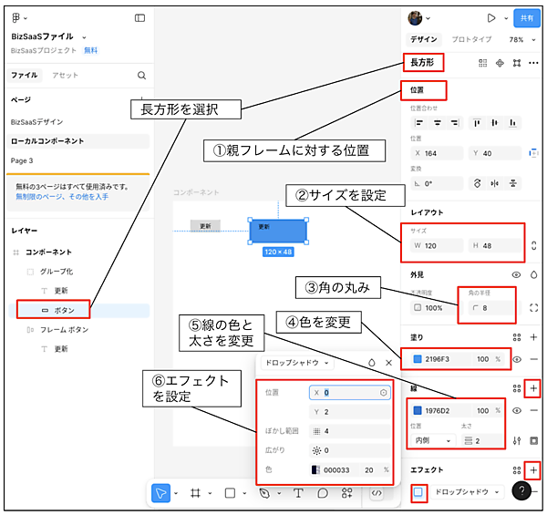 長方形「ボタン」に色を付けてみましょう。長方形の現在の色はHEXで#D9D9D9(灰色)が設定されていると思います。ここをクリックして#32196F3という値(青色)に変更してみてください。