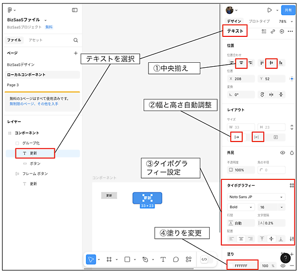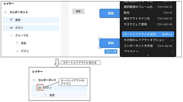 これで、オートレイアウト「ボタン」の中にアイコン「更新アイコン」とテキスト「更新」が含まれました。次は3つのUI要素のプロパティを設定していきましょう。レイヤーパネルを見ると「フレーム ボタン」が親、テキスト「更新」とフレーム「更新アイコン」が子の関係であることが確認できます。