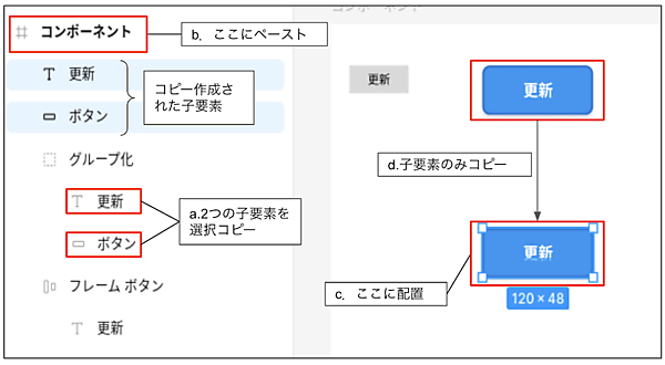 図3のようにレイヤーパネルのグループ化の下にあるテキスト「更新」と長方形「ボタン」を一緒に選択してコピーし(a)、最上位のフレーム「コンポーネント」の上でペーストしてください(b)。フレーム「コンポーネント」直下の子要素としてテキスト「更新」と長方形「ボタン」が作成されます。作成されたUI要素は、キャンバス上ではグループの下の位置に配置します(c)。これにより2つの子要素だけのコピーが作成されます(d)。