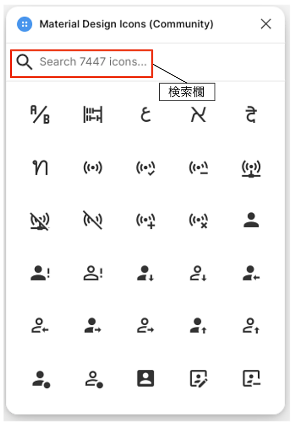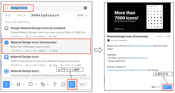 から「プラグインとウィジェット」タブを開き、“Disign icons”というキーワードで検索してください。コミュニティや企業(GoogleやIBMなど)からアイコンが提供されていることが分かります。今回は、この中から「Material Design icons(Community)」を選びます。 - b.「Material Design icons(Community)」