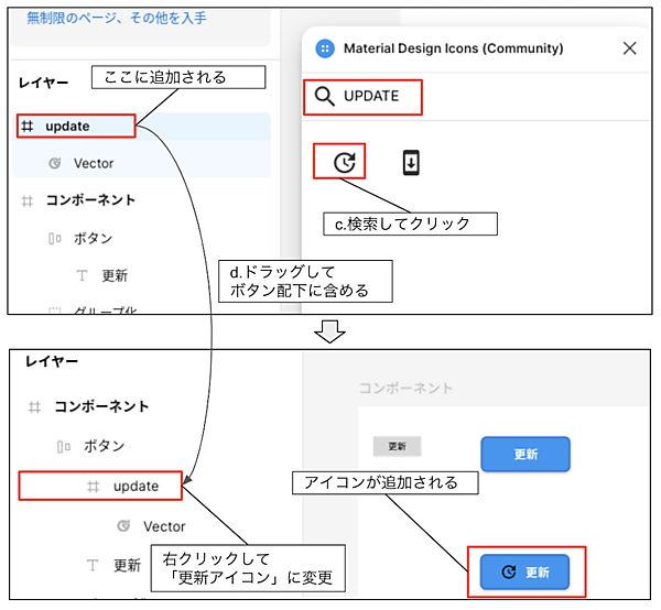 レイヤーパネルでフレーム「UPDATE」をドラッグして、フレーム「ボタン」の上に移動してください。図7下のようにフレーム「UPDATE」が「ボタン」の子要素となれば成功です。キャンバスを見ると、ボタンの中にアイコンが追加されていることが確認できます。レイヤーパネルで「UPDATE」を右クリックして名前を「更新アイコン」に変更しておきましょう。「UPDATE」の子要素のVectorの方はそのままでOKです。