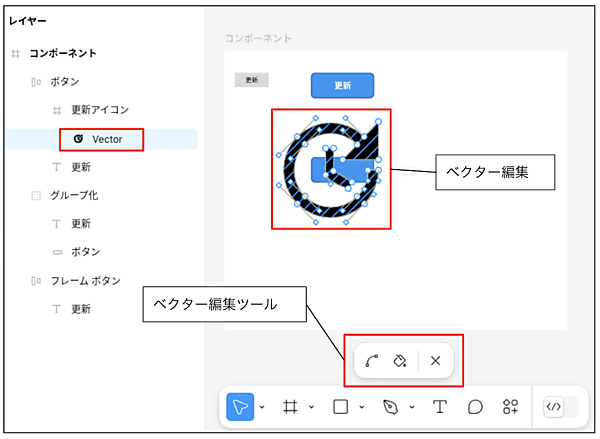 レイヤーパネルの「更新アイコン」フレームにはVectorという名前の子要素が含まれています。ベクターとは画像を数値形式で表現する方法で、図形や線、点などの位置座標をもとに描画するものです。ピクセルの集合体であるラスター形式とは違い、ベクター形式は拡大しても図形の品質が維持されます。線や点を個別に編集できる特徴があり、アイコンやロゴ、イラストなどに使われています。ラスター形式の代表例はPNG、JPEG、GIFで、ベクター形式はSVG(Scallable Vector Graphics)やAI(Adobe Illustrator)です。