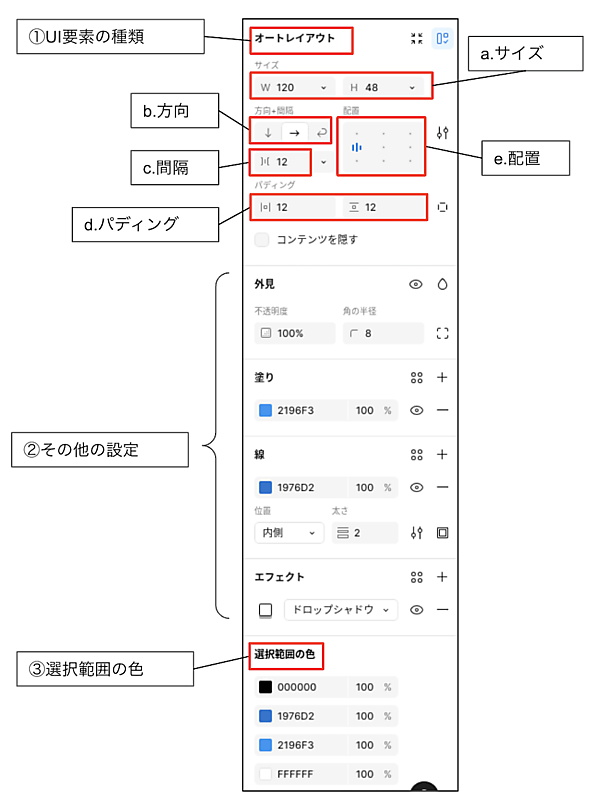 方向は子要素(ここではアイコンとテキスト)を自動的に配置(オートレイアウト)するための設定です。「縦に並べる」