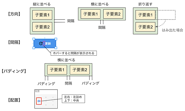 図10を使って「方向」に関して少し補足しましょう。「縦に並べる」は子要素を縦1列に並べる設定で、リストやグリッドなど要素を縦に並べる際に使用します。「横に並べる」は子要素を横に並べる設定で、ヘッダーにメニューを並べたりフッターにボタンを配置するときに便利です。「折り返す」は、子要素が親要素をはみ出たときに折り返す動的設定で、レスポンシブデザインのボタン配置などで使用します。