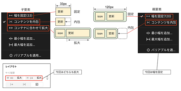 - オートレイアウトを使うと子要素と親要素のサイズも関連付けて自動調整できる