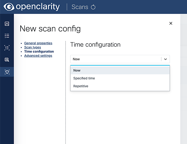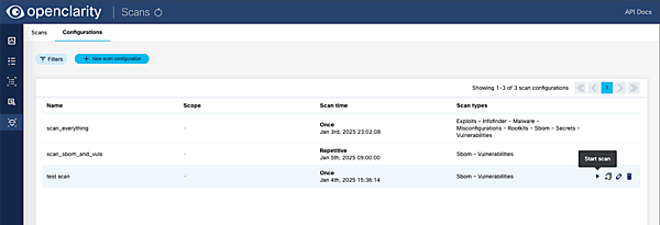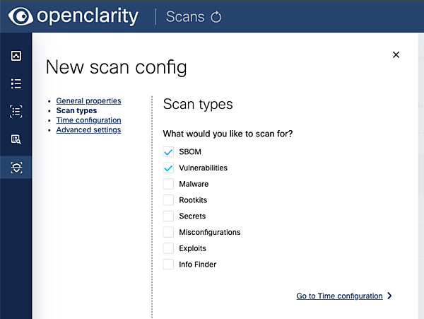 左ペインのScansからConfigurationsに遷移し、New scan configurationで設定を作成します。ここでは、どの項目をスキャンするかやスケジュールなどを指定できます。