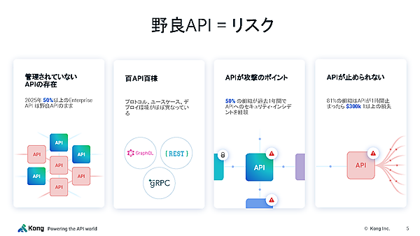 ウェンハン・シ氏は、このようなAPI管理の状況について「現在、世界中のエンタープライズAPIの50%以上が適切に管理されていないと言われています。この状況は、APIを経由した攻撃のリスクを高めるだけでなく、システム全体の信頼性を損なう原因にもなります」と言及しています。