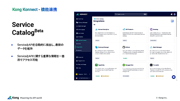 Kong Konnectが提供する「Service Catalog」は現在ベータ版でありながら、APIの管理と活用に新たな可能性をもたらす注目すべき機能です。この機能は、APIの定義から構築、運用、変更管理までを包括的にサポートします。