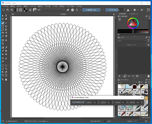 まず、プッシュボタンUIで直線を回転させながら複製すると単純な放射状の幾何学模様が作れます。さらにスピンボックスUIで1つ目のコントロールポイントのY座標を移動してプッシュボタンUIを押すと、ちょっとした幾何学模様が作れます。それから2つのコントロールポイントのXY座標を移動できるようにすれば本格的な幾何学模様が作れます。