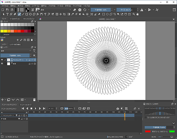 その作品ではPhotoshopで、針金クリップを滅茶苦茶に曲げたような適当な曲線を描いて複製ツールで回転しながら何百個もコピーした幾何学模様を描いていました。「こんなに簡単に綺麗な幾何学模様になるんだ」と感心したものでした。それを20年ぶりぐらいに思い出し、KritaでPythonをプログラミングしてやってみたというわけです。