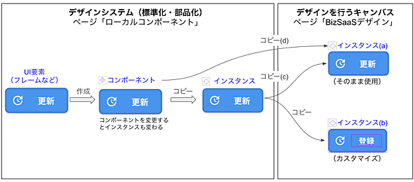 図1は左側のデザインシステム(ローカルコンポーネントページ)でインスタンスを作成し、右側のキャンバス(BizSaaSデザインページ)上でデザインを行う想定にしています。特にカスタマイズが必要ない場合はインスタンスをそのまま使用します(a)。カスタマイズしないので、コンポーネントを変更した際にその変更が反映されて一貫性を保ちやすくなります。