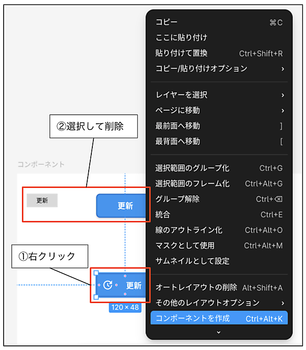 図1を使って説明しましょう。UI要素(フレームなど)を右クリックして「コンポーネントを作成」するとUI要素はコンポーネントコンポーネントとインスタンスの関係