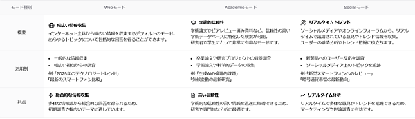 一方で、現時点では情報の精度や深度に課題があり、一部のユーザーから「複雑なクエリで期待通りの結果が得られない」と指摘を受けています。また深い調査には数分を要するため、即時性に欠ける場合がある点も課題です。しかし、その多機能性と利便性から多くのユーザーに支持されており、さらなる進化が期待されています。