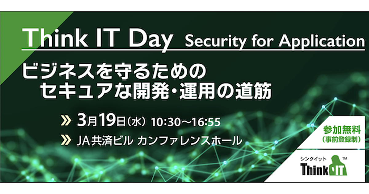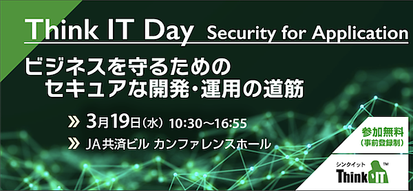 Think IT編集部は「Think IT Day Security for Application 〜 ビジネスを守るためのセキュアな開発・運用の道筋」を3/19(水)に東京・JA共済ビル カンファレンスホールで開催する。