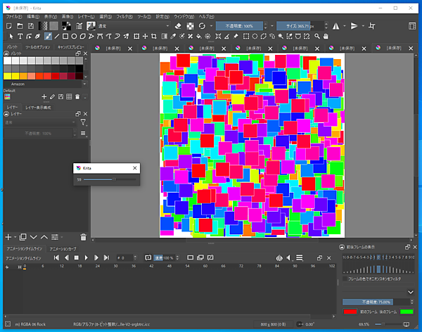 次のサンプルスクリプトをスクリプティングしてKritaを再起動し、「新しい画像」を開始して「カスタムドキュメント」を「作成」します。それからshortcutタグにセットした[Ctrl]キー+[Alt]キー+[Shift]キー+[D]キーを全て押すとショートカットキーが実行されます。スライダーUIが表示され、スライダーをドラッグすると正方形がランダムに描画されます。