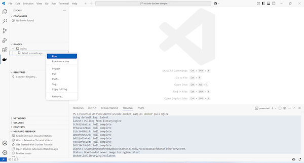 ただし、Docker拡張機能にはコンテナイメージの取得機能がありません。そこで、あらかじめターミナルからイメージを取得しておきましょう。メニュー > ターミナル > 新しいターミナルからターミナルを起動して、以下のコマンドを実行してください。