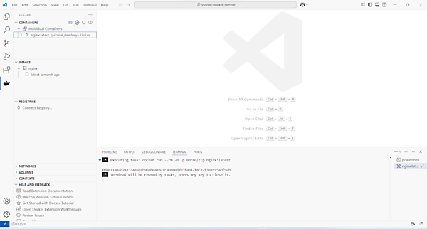 Docker拡張機能(以降、VS Codeの拡張機能のことを指す)でコンテナを起動し、操作の流れを確認しましょう。ここでは、公式のNginxイメージを使ってWebサーバーを起動してみます。