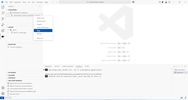 これで、VS Codeの拡張機能を使ってDockerコンテナが起動できました。確認できたら、起動中のコンテナを停止してみましょう。コンテナセクションから起動中のコンテナを右クリックして「Stop」を選択します。