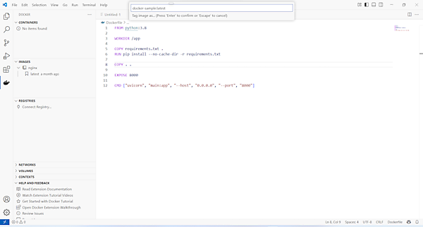 作成したDockerfileからコンテナイメージをビルドします。[Ctrl]キー+[Shift]キー+[P]キーを押してコマンドパレットを開き、「Docker Images: Build Image...」を選択してください。続いてコンテナイメージに付ける名前を入力します。デフォルトでは開いているディレクトリの名前が自動的に設定されていますが、分かりやすい名前に変更することをオススメします。ここではdocker-sampleとしました。
