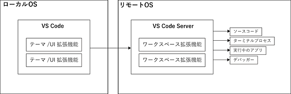 VS Code上でリモート開発環境とは、ローカルPC上のVisual Studio Codeを通じてリモートマシンに接続し、VS Codeの使い勝手をそのままにリモートマシン上の開発環境を操作することを指します。VS Codeのリモート開発環境は接続先を選ばないため、WSLやDockerコンテナ、クラウド上の仮想マシンなど、さまざまな環境と接続しながら、ローカルPC上のVS Codeの使い勝手を損なうことなくリモート環境で開発ができます。