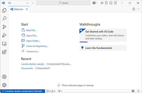 リモート開発環境としてコンテナに接続され、VS Codeのウィンドウが開きます。左下の青いバーに「Container docker-sample:latest...」と表示されていれば、リモート開発環境に接続されています。