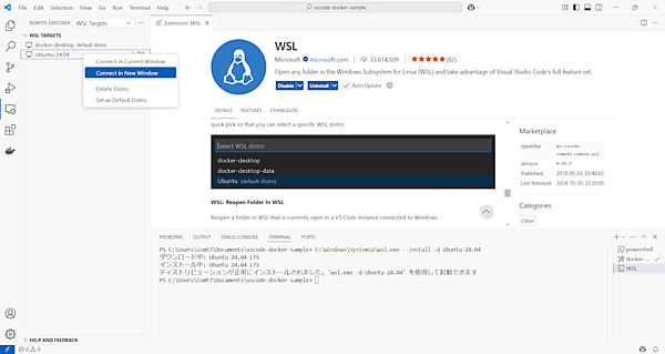 セクション上にWSLディストリビューションが表示されたら、右クリックして「Connect in New Window」を選択します。接続が完了すると、リモートエクスプローラービューにWSLディストリビューションが表示されます。
