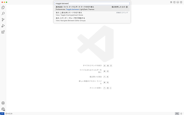 画面上部のメニューから表示 → コマンドパレットを開き、Toggle between Light/Dark Themesを検索して選択します。