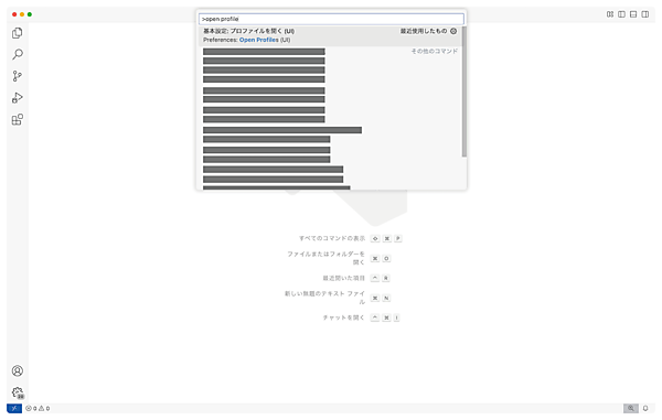 画面上部のメニューから表示 → コマンドパレットを開き、Open Profileを検索して「基本設定: プロファイルを開く」を選択します。