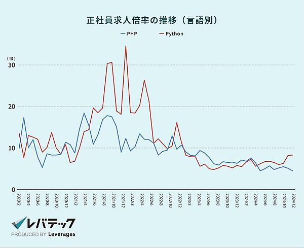例えば「Python」の求人倍率*2は2021年12月時点で34.5倍でしたが、2024年12月には8.3倍に落ち着きました。「PHP」も2021年12月時点の12.3倍から2024年12月には4.5倍となっています。