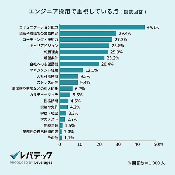 レバテックが過去に実施した調査*3によると、エンジニア採用において企業担当者が最も重視しているのは「コミュニケーション能力(44.1%)」となり、次いで「現職や前職での業務内容(29.4%)」「コーディング・技術力(27.3%)」が挙げられました*3。