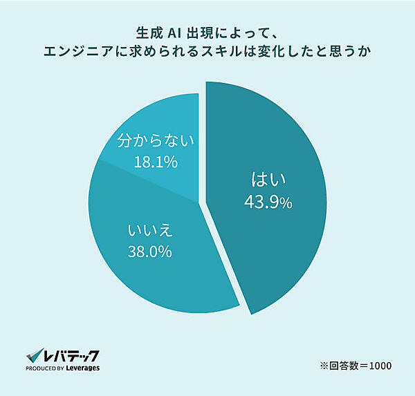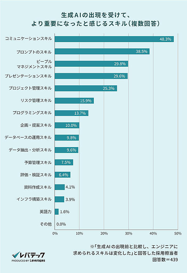 さらに、生成AIの普及によりエンジニアに求められるスキルも変化しています。レバテックの調査*4では、採用担当者の4割以上が「エンジニアに求めるスキルが変化した」と回答しており、その中で特に重要視されるようになったのが「コミュニケーションスキル(48.3%)」でした。生成AIが業務効率化を進める中、複雑化するプロジェクトやチーム間の連携が求められる現代では、今後ますますコミュニケーション能力が重要になると言えるでしょう。