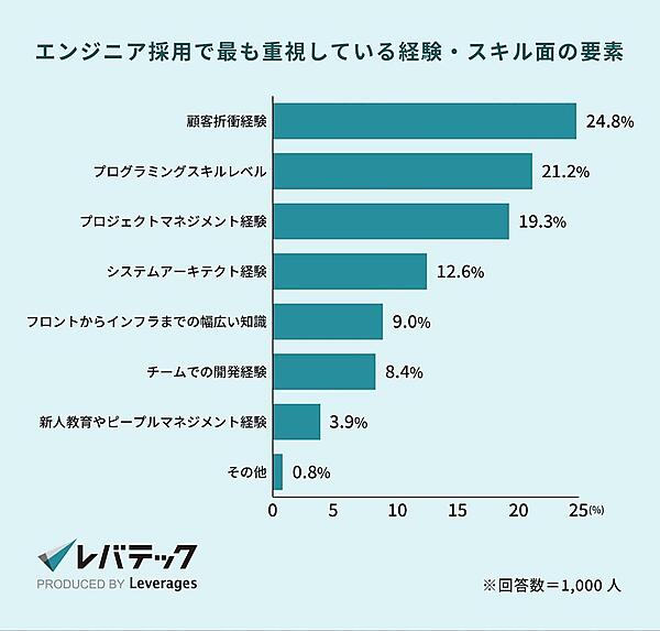 また、レバテックの調査では、採用時に注目される経験やスキルとして「顧客折衝経験(24.8%)」や「プロジェクトマネジメント経験(19.3%)」が上位に挙がりました*5。これらの結果からも分かるように、前職までの経験の中でも特に、クライアントとの信頼関係を築きながら課題解決に取り組む能力や、プロジェクトを推進した実績が重視される傾向があります。