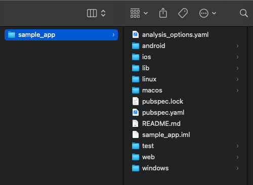 このコマンドにおけるsample_appはプロジェクトの識別子となります。ご自身で好きな名前に変更いただいて構いません。なお、命名規則として英小文字とアンダースコアを使用したスネークケースが推奨されています。このコマンドを実行すると、Flutterが自動的に以下の処理を行います。