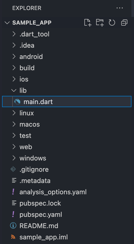 libフォルダはFlutterアプリケーションの心臓部です。ここにすべてのDartコードを配置します。まだ作成したばかりのこのプロジェクトにはmain.dartファイルのみが存在しています。このファイルがアプリケーションのエントリーポイントとなります。