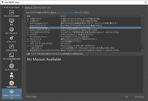 Krita.instance().addDockWidgetFactory(DockWidgetFactory("MyDockerMessageBox", DockWidgetFactoryBase.DockRight, MyDockerMessageBox))【サンプルスクリプトの解説】