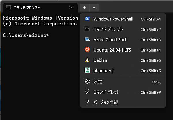 インストールが完了したら、一度Windows Terminalを再起動してください。その後タブバーにある下向き矢印をクリックすると「ubuntu-vtj」という(wsl-distribution.confで指定した名前の)プロファイルが追加されているはずです。これを選択して、ディストリビューションを起動してみましょう。