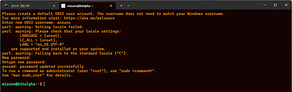 echo 'Please create a default UNIX user account. The username does not need to match your Windows username.'