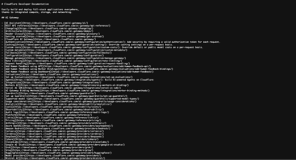 Cloudflareのドキュメントでは「llms.txt」と「llms-full.txt」を提供しています。これはLLM向けに読み込ませることで、より質の良い回答が期待できるように作られているファイルです。Markdownで書かれており、llms.txtはリンクのみ、llms-full.txtはドキュメント全体が記されています。