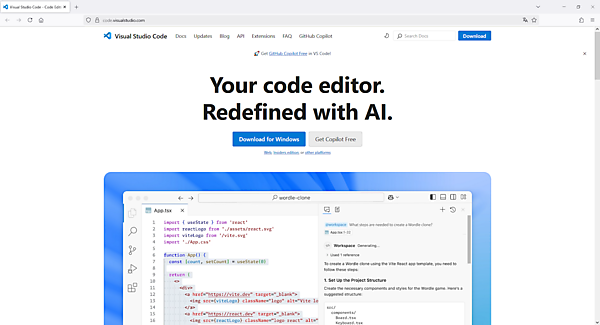 VS Codeの公式サイトにアクセスして、「Download for Windows(またはmacOS、またはLinux)」からダウンロードしてインストールしてください(図6)。こちらも、インストール手順は画面の指示に従っていけば完了するので、説明は割愛します。また、ここではコードエディタとしてVS Codeをお勧めしましたが、必ずしもVS CodeでなくてもOKです。