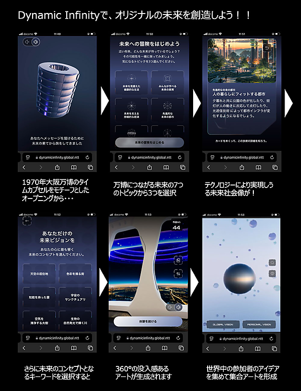 NTTが提供するウェブコンテンツ「Dynamic Infinity」は、来場者参加型のAI体験。この展示は、ユーザーが選んだ21種類の未来社会シナリオから1つを選択し、その選択に応じて生成AIが一人ひとり異なる未来のビジョンを3D画像で描き出すというもの。生成される未来像は、都市のあり方、働き方、ライフスタイル、自然との共生といったテーマに沿って構成されており、個々人の想像力と生成AIの演算が融合していくユニークな体験が可能です。
