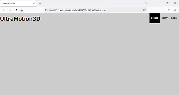 「css」→「main.css」と「index.html」に続いて、次のサンプルコードをコーディングしてWebブラウザでindex.htmlを開いてください。右上のLIGHT、GRAY、DARKの3つのメニューをクリックすると、それぞれライトグレー、グレー、ダークグレーの背景色に変わります(図4)。